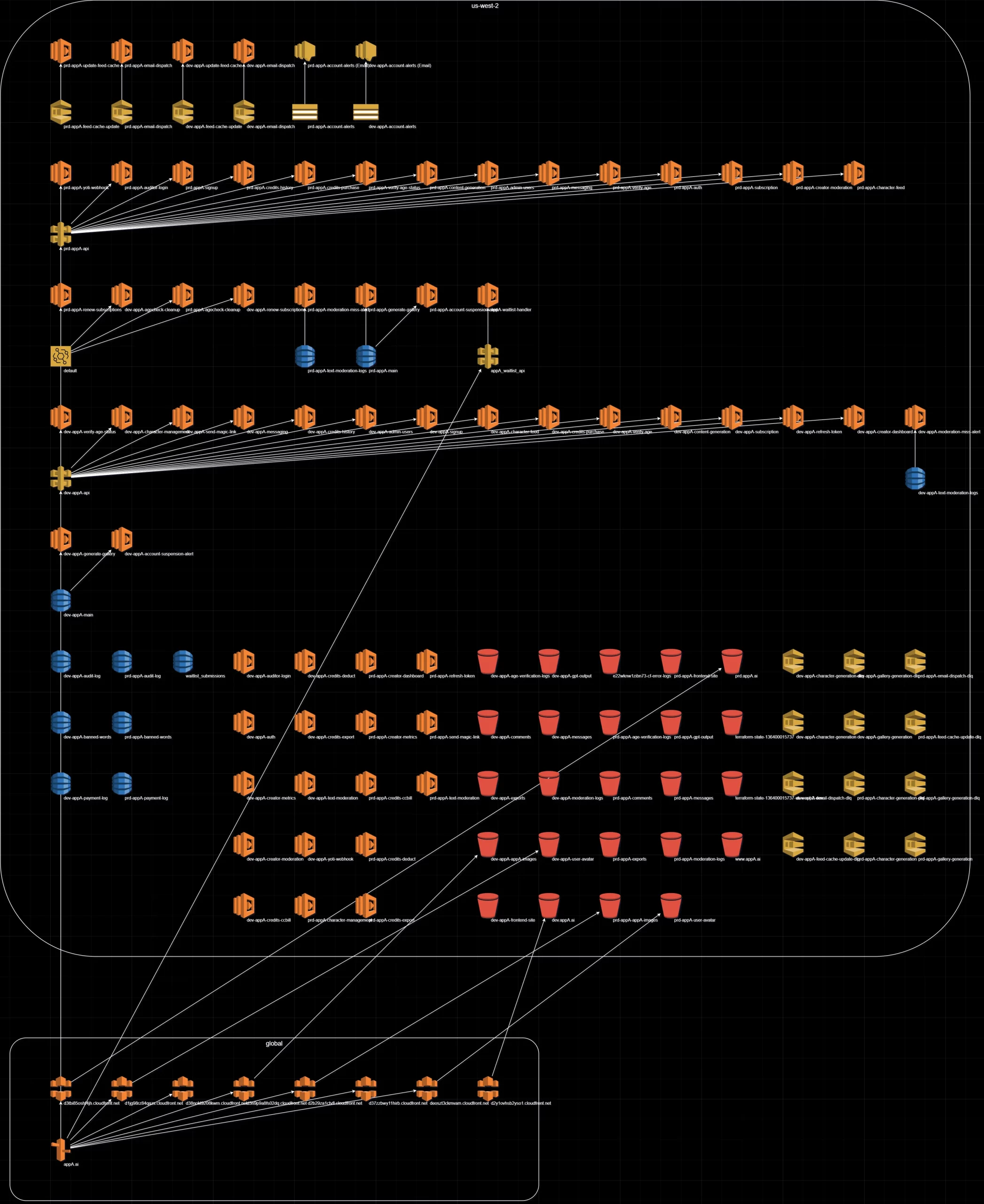 As a solo operator running a content platform with AI-driven features, I've learned the importance of building an architecture that's scalable, compliant, and manageable without a large team. Today, I'm excited to share the architecture behind appA, a serverless platform hosted in AWS us-west-2, designed to support user authentication, content moderation, payment processing, and more—all while prioritizing regulatory compliance in an ever-evolving AI landscape. Lawmakers are struggling to keep up with rapidly changing regulations, especially around AI, and appA leads with compliance to ensure we're prepared for the future. Here's a deep dive into the architecture, my operational strategies, and the lessons I've learned along the way.
